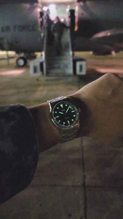 The watch uses Luminova instead of the Tritium that was used in the 1960s. The main advantage of Luminova is that, unlike Tritium, it does not deteriorate with age and is non-radioactive. This variant features paint that mimics the appearance of aged Tritium paint.